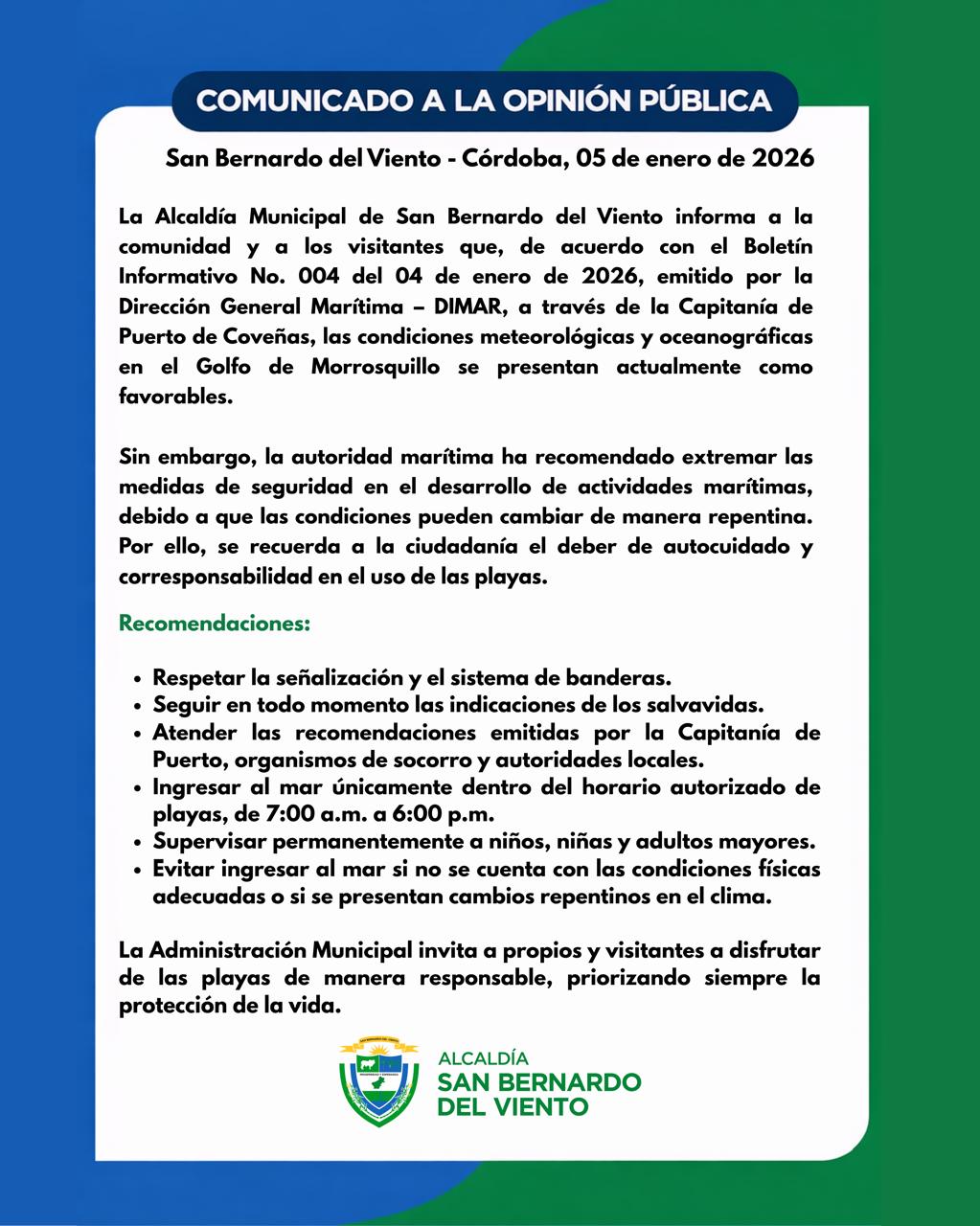 La Alcaldia Municipal de San Bernardo del Viento informa a la